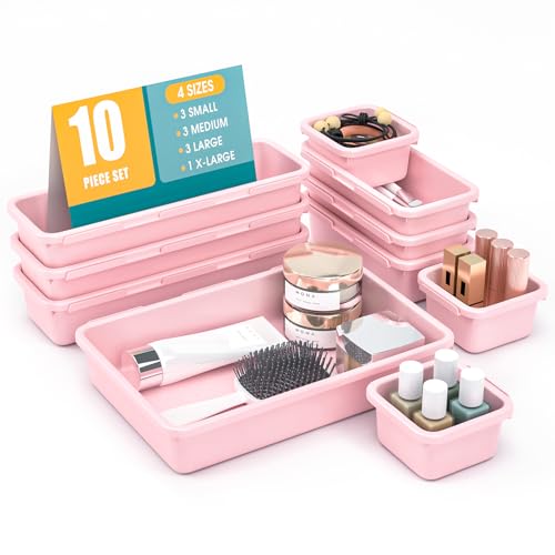 10 PCS Drawer Organizer Set, 4 Size Makeup Drawer Divider Organizer With Non-Slip Pads, Interlocking Plastic Storage Bins for Office,Jewelry Vanity,Gadgets, Bathroom,Kitchen, Pink