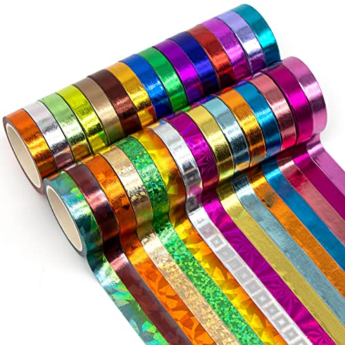 - 30 ROLLS OF FOIL WASHI TAPE – Give all your craft and DIY projects the star treatment! 30 rolls of strong foil paper tape, each with an intensely vivid shine. Make your cell phone cases, storage boxes, and picture frames twinkle, or create sparkling wall art in on-trend metallics. W:8mm x L:4m