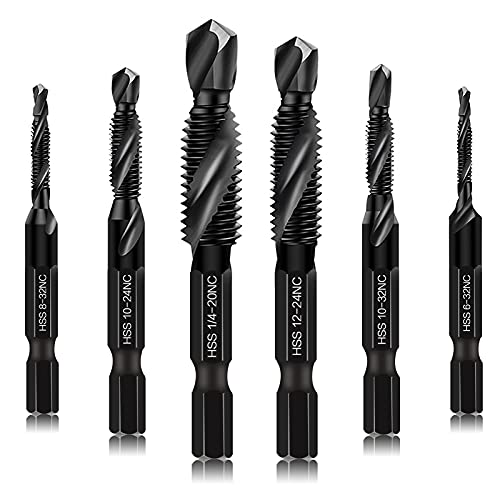 • HIGH VERSATILITY – Set of 6 drill tap bits in SAE sizes 6-32NC, 8-32NC, 10-24NC, 10-32NC, 12-24NC, ¼-20NC, with 1/4inch hex quick-change shank, fit Electric hand drill, impact drill, bench drill, electric screwdriver and other tap machines.