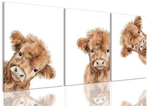 AOYUSMO 3 Piece Cute Highland Cow Canvas Wall Art Nursery Funny Animal Framed Wall Art Baby Cow Pictures Wall Decor Kids Animals Art Prints for Children’s Room Bedroom 12″x16″
