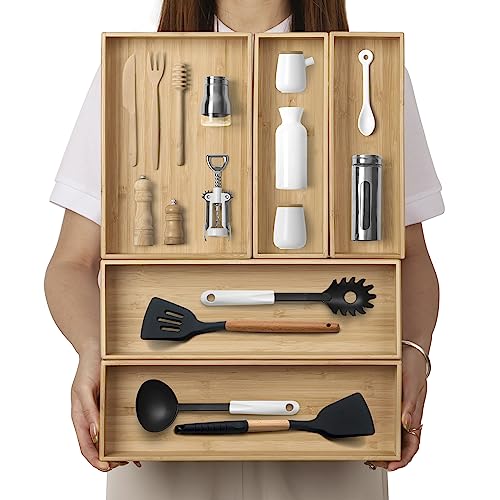 BAMOTTO CRAFTBAMBOO Stack Bamboo Drawer Organizer Set of 5, Kitchen Utensil, Flatware&Silverware Organizer-Wood Laminated Stackable for Kitchen, Bedroom, 13.4”x4.5”*2+10.2”x3.3”*2+10.2”x6.7”*1