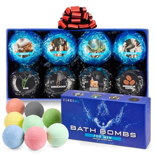- 8 MANLY SCENTS – carefully selected bath bombs set for men including sandalwood, cedar, cologne, coffee, whiskey, and vanilla. Long fizzing and with a strong smell for the best experience he deserves. Time to relax the muscles and let tensions fade away!