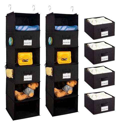 BrilliantJo 2 Pack 6 Shelves Hanging Closet Organizer with 2 Drawer, Hanging Storage with 4 Side Pockets for Clothes Shoes, 43.5″x12″x12″(Black)