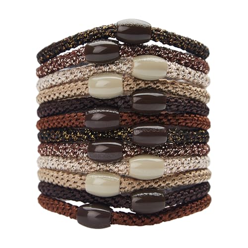 • BROWN HAIR TIES: Includes 12 hair ties in golden mocha tones with a silky sheen, each with a matching bead for a cozy, timeless look. Bands are 1/8″ thick, 2″ diameter.