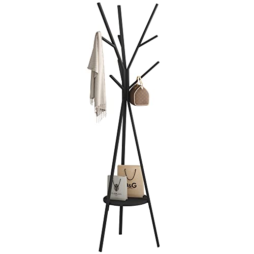 - 【Decorative and Functional Metal Coat Hanger Stand】Practical and at the same time can be a good decoration at home.Ample storage space,totally 3 main branches with 9 hooks ,this coat hat standing hanger is a perfect storage solution for coats,handbags,scarves,hockey gear,motorcycle helmets,jackets,gloves and more.The bottom circle shelf can store drawer units ,bins,toys and flowerpot as you please.
