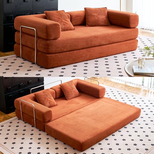 Compression Sofa – 78”Convertible Floor Sofa Bed – with Pillow Back Support Armrest – Comfy Foldable Sofa Bed Compressed Sofa in Box – Corduroy Fabric – for Living Room Bedroom(Orange)
