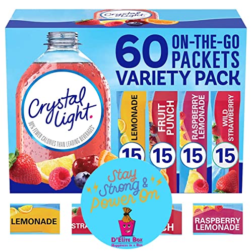Crystal Light Sugar-Free, Lemonade, Fruit Punch, Raspberry Lemonade and Wild Strawberry On-The-Go Powdered Drink Singles Mix Variety Pack, 60 Count, Each Packet Dissolves into any 16.9 oz. container and comes with a Bonus Inspirational Magnet by D’Elite Box