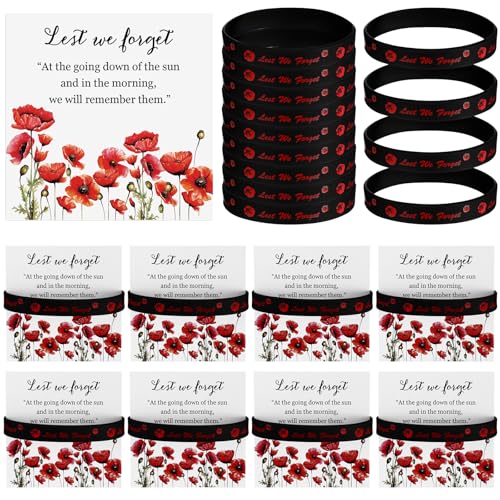 - Red Poppy Design: get immersed in the patriotic ambience with our Veterans Day bracelet and memorial cards; The hues are inspired by the red poppy, symbolizing remembrance and respect, printed with the words of [lest we forget], expressing our condolences to those who died on the battlefield, and we can give them to our fathers or friends on Veterans Day, Memorial Day and Remembrance Day