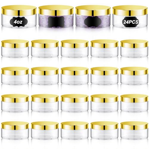 Dandat 24 Pcs 4 oz Plastic Jar Container with Lid and Label Refillable Empty Round Clear with Gold PET Cosmetic Sample Containers for Lotion, Cream, Ointments, Body Butter, Makeup, Travel Storage
