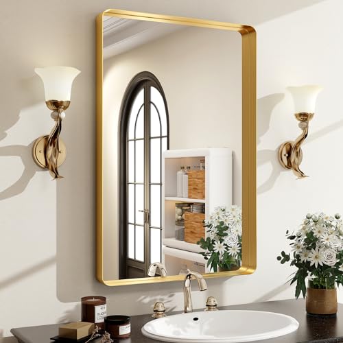 Easly 30 x 22 Inch Gold Bathroom Mirror for Wall,Aluminum Alloy Frame Rectangular Wall Mounted Mirror for Farmhouse Decor Horizontal or Vertical Ideal for Bedroom, Living Room