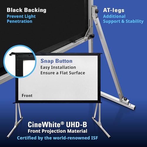 - 【Features & Includes】Features a fully tensioned snap button frame that ensures a flat projection. Includes single-piece aluminum frame with Detachable T-Legs could increases stability,carrying bag,ground stakes,rigging cord,and support rings