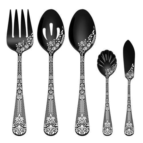 - 5 PIECE SERVING SET: In this pretty black serving utensils set you will get the serving spoon×1, slotted serving spoon×1, serving fork×1, butter knife×1, and sugar spoon×1. These large serving utensils for parties will perfectly satisfy your daily demands in serving, cooking, baking, and filtering.