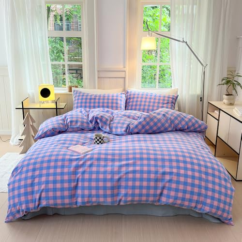FACE TWO FACE Bedding Duvet Cover Set100% Washed Cotton Duvet Cover Linen Like Textured Breathable Durable Soft Comfy (Twin, Blue Purple Grid)