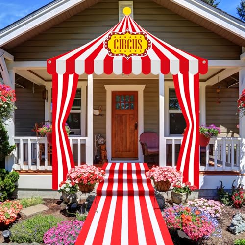 - Carnival Party Set: carnival entryway decoration kit includes 1 circus awning decoration with circus printed sign pattern, 2 red and white striped carnival banners, 1 carnival floor runners, 1 roll of double sided tape for easy hanging and sticking