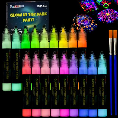 FansArriche Glow in the Dark Fabric Paints, 18 Colors x 20 ml 3D Waterproof Acrylic Textile Paint Markers, Glow in Dark Paint Pen, DIY Neon Fabric Paints for Clothes, Canvas