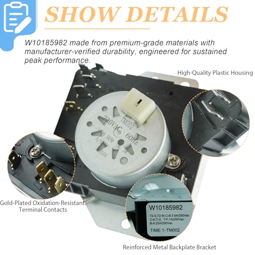 - DRYER TIMER PART: W10185982 timer can replace WPW10185982, 1546812, AP6016541, PS11749831, EAP11749831, 418-618-20-B5, W10185982 F, W10185982 E, W10185982 G. The W10185982 timer replacement part undergoes rigorous performance tests before leaving the factory, exceeding OEM specifications. It crafted from high-quality materials (reinforced metal backplate bracket and high-quality plastic housing) and can protect the wire well and effectively prolong the service life. Product information: 230VAC, 60hz
