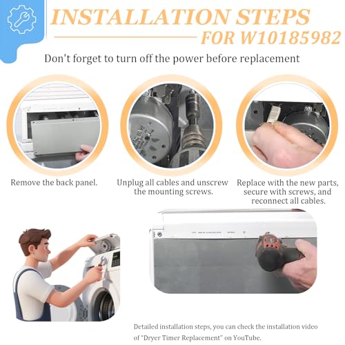 - FIXES THE SYMPTOMS: W10185982 timer resolve common dryer issues like inconsistent drying cycles, continuous operation, failure to start, burnt odors caused by faulty components. If your dryer has any of these problems, it may be necessary to replace W10185982 timer and easy to install, which only takes a few minutes to complete. You also can follow Youtube online repair videos to make repairs easier and faster.
