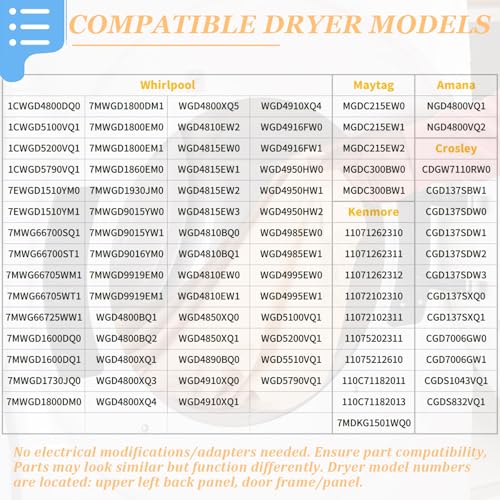 - FIT MODELS: Compatible with Maytag MEDC215EW0, MEDC215EW1, MEDC300BW0, 3LMEDC315FW0, 3LMEDC415FW0, 4KMEDC300BW1, 4KMEDC315FW0, 4KMEDC415FW0, 4KMEDC420JW0, 4KMEDC425FW0, 4KMEDC430JW0, 4KMEDC440JW0, 7MMEP0080WW0, 7MMEP0080WW1. Compatible with Amana NED4800VQ1, 4KAED4900BW1, 4KNED3200JW0, 4KNED4600BQ1. Compatible with Kenmore 110.62102311, 110.65202311, 110.65212610, 110.C61102011, 110.C61112010, 110.C61182010, 110.C61182011, 110.C62102310. Please make sure to check your dryer model before purchase.