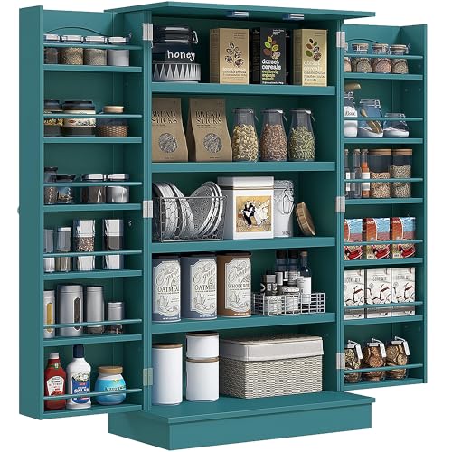 - Upgrade Your Storage: Featuring 5-tier interior shelving and 12-tier side racks behind the doors, this pantry cabinet gives you plenty of room for dishes, cookbooks, pots and pans, spice jars. Meanwhile, the side racks are designed with bars to prevent items from falling over. If you have taller items, the adjustable shelves can be customized to fit items like pitchers, pasta containers and blenders.