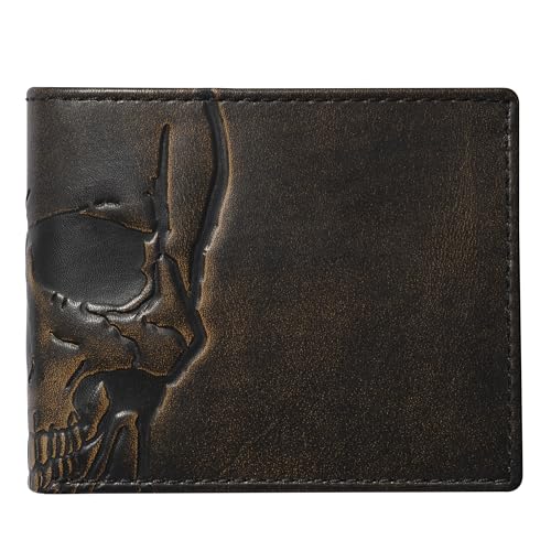 - Bold Design: Jack’s Skull Bifold Wallet blends bold style with expert craftsmanship; made from premium full-grain leather with a meticulously embossed skull graphic; hand-burnished for a vintage look that ages beautifully over time; full-sized design with Flip ID construction for added convenience and functionality