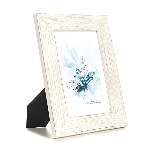 KAIWIN 100% Solid Wood White 5×7 Picture Frame 1 Pack – Display Picture 4×6 with Mat, HD Glass Inside, Rustic Wooden Photo Frames for Table Top and Wall Mounting