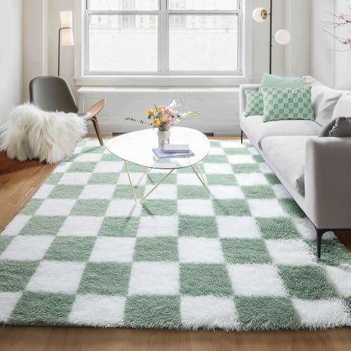 KICMOR Living Room Rugs 5×8 Sage Green and White, Large Fluffy Furry Shaggy Fuzzy Checkered Area Rug Bedroom Big Carpet, Shag Plush Soft Nursery Rug Cozy Room Decor for Teen Toddler Kids Baby Boys