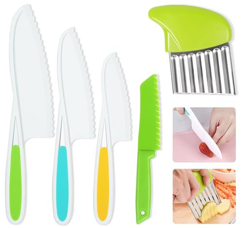 Kids Knife Set 5 Pcs Toddler Safe Knives Plastic Child Friendly Knife with Crinkle Cutter BPA-Free Serrated Edges Kitchen Tools for Real Cooking and Cutting Lettuce Board Sandwich