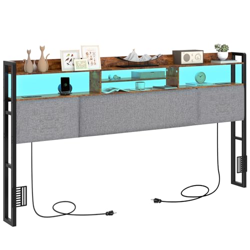 Livofloral King Size Upholstered Headboard with 2 Outlets and LED Lights, King Bed Headboard with Charging Station & Storage Shelves, King Headboard Only, Height Adjustable, Easy Assembly, Brown