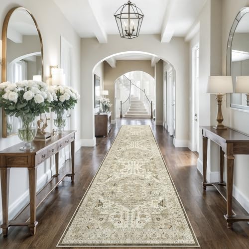 Madane Hallway Runner 3×14 – Runner Rugs 14ft Washable Entryway Rug Vintage Kitchen Runners Non Slip Indoor Area Rug Farmhouse Carpet Runner for Bathroom Living Room Bedroom, Ivory/Brown