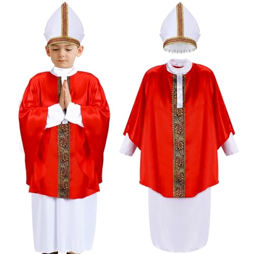 - Pope Costume set: You will receive 1 red papal poncho, 1 white pastor robe, 1 priest pope hat, a complete set to meet your Halloween costume needs, sophisticated and eye-catching, Our striking pope costume for kids will bless the eyes of everyone at your event.