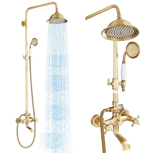 MOSSON Antique Brass Shower System Bathroom Shower Faucet Set with 8 Inch Shower Head Handheld Spray and 360 ° Rotation Tub Spout 2 Cross Handles Outdoor Shower Fixtures