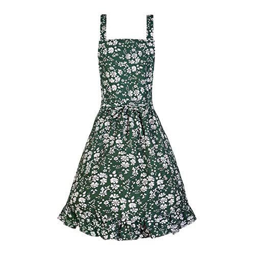 Pinknoke Vintage Pinafore Apron Dress for Women with Pockets Cute Floral Chef Aprons for Kitchen Cooking Baking Gardening (Green)