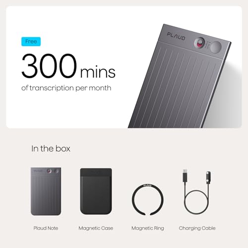 - EVERYTHING YOU NEED IS INCLUDED: 1 Plaud Note, 1 Black Case, 1 Magnetic Ring, and 1 Magnetic Charging Cable. PLUS: All users enjoy a complimentary 300 mins/month for advanced AI-powered transcription and summarization services