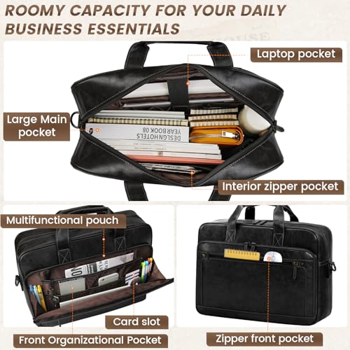 - Large Capacity & Multiple Pockets: The leather laptop bag has spacious compartments that provide separate space for a 16 inch laptop, iPad, documents, and all your belongings. It has multiple pockets, including a padded laptop pocket and a main compartment with a zippered pocket. The front compartment has multiple slots and a keychain. There is a front zipper pocket for easy access to personal items. It keeps everything organized and within reach, which is a perfect business briefcase for men.
