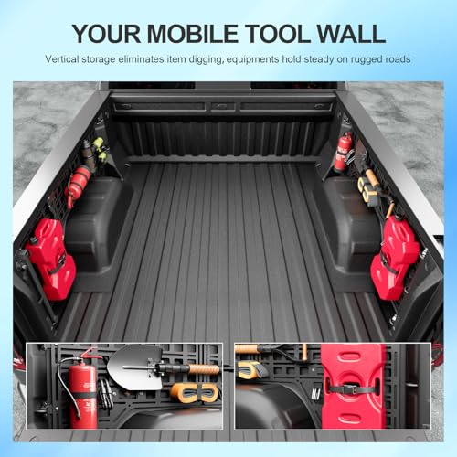 - Function: The bed molle panels can hold a variety of tools, such as off-road equipment high lift jacks,axes,shovels,flashlights,off-road gear,etc.They will expand storage space and prevent items from sliding around during the driving process.