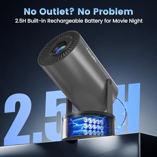 Tecaki Portable Projector with Built-in Battery, Outdoor Movie Projector for Camping, Backyard, Bedroom, Mini Projector with WIFI and Bluetooth, 180° Rotatable Stand, Auto Keystone, Electric Focus
