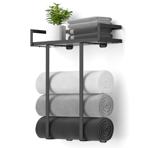Towel Racks for Bathroom Wall Mounted, Xstydes Metal Towel Holder with Wooden Shelf for Folding Large Towels, Towel Storage for Small Bathroom Organizer Decor or RV Camping, Black