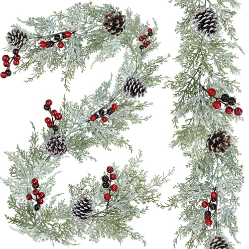 • Quantity: Package includes 2 pcs artificial snowy cedar garlands Christmas greenery garlands. Each one contains 5 frosted pine cones, 7 faux red berry clusters and more lush cedar pine. You can combine two winter garlands together to make a largr garland. Enchant your holiday home, winter wedding, bridal shower, Christmas, holiday-themed party, and event decor. Add a winter wonderland feel to your holiday decorations this season with these snowy cedar garlands.