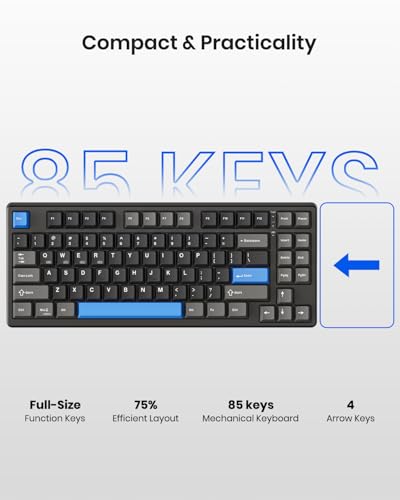 - 【Less Keys, More Desk】As a 75% layout keyboard with 85 keys, it retains essential keys (F1-F12, arrow keys, shortcuts) while omitting the dedicated right-side number pad to keeping its compact form. Ideal for small desks, laptop setups, or anyone looking to maximize desk space efficiency. The mechanical keyboard runs on a robust 4000mAh rechargeable battery, with moderate using, it can last up to a week.