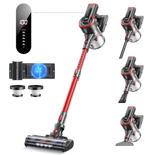 - 【Touch Screen & 5 Suction Modes】The digital touch screen feature enables real-time monitoring and adjustment of suction power levels for the cordless stick vacuum cleaner. With its newly upgraded sliding-type stepless adjustment, it offers five levels of suction power, catering to various cleaning requirements. Specifically designed for carpet cleaning, its maximum mode and powerful floor brush streamline vacuuming tasks, ensuring efficient and effective cleaning.