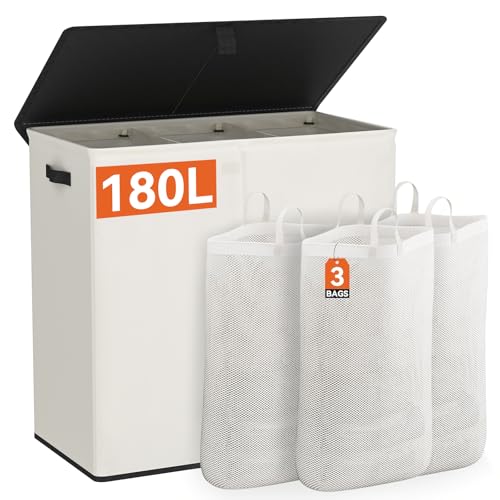 WOWLIVE Laundry Hamper with Lid,180L Large Laundry Basket 3 Section with Removable Washing Bags,Collapsible Waterproof Dirty Clothes Hamper for Laundry Room Bathroom Dorm,Beige